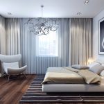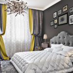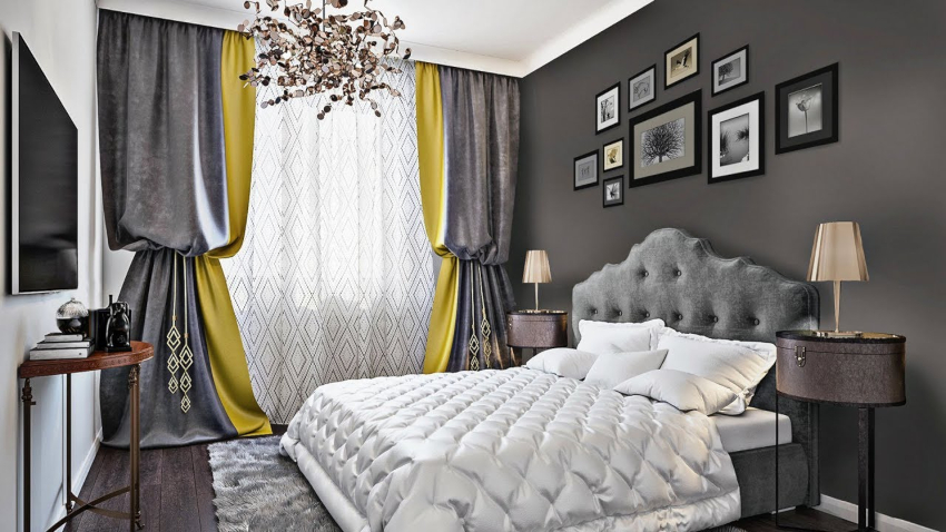 The approach to choosing curtains for a gray bedroom should be completely different. So that the room as a whole is not dull, you should revive the room with the help of window curtains. Depending on the interior, it is appropriate to arrange the window with canvases with a pattern, with a glossy surface, which must necessarily have a small number of elements of gray color or its shades. Decorating with frills, braid, lambrequins is acceptable. Vivid contrasts should be avoided. When decorating Scandinavian bedrooms, white and light gray curtains without artistic processing will become harmonious.