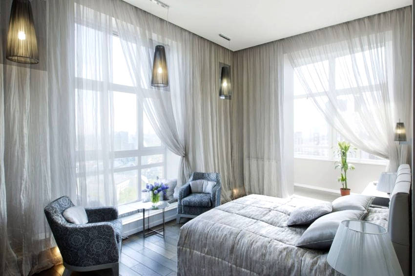 Windows, inaccessible to prying eyes, do not need to be covered with thick curtains. To decorate window openings, it is enough to hang curtains in the bedroom. This option has a number of undeniable advantages, especially if used in small rooms: