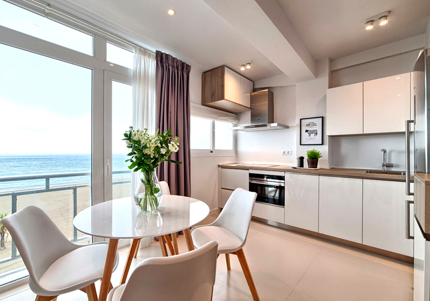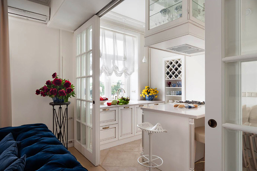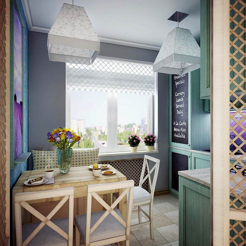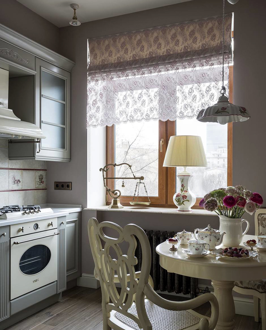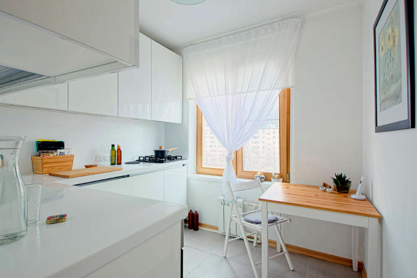 - The design of tulle in the kitchen, if necessary, should not interfere with the free opening of a window or balcony.