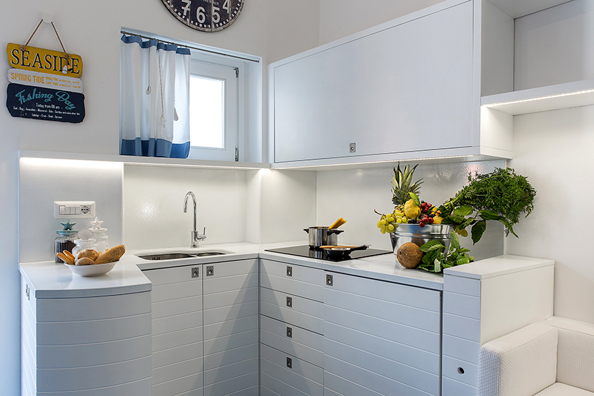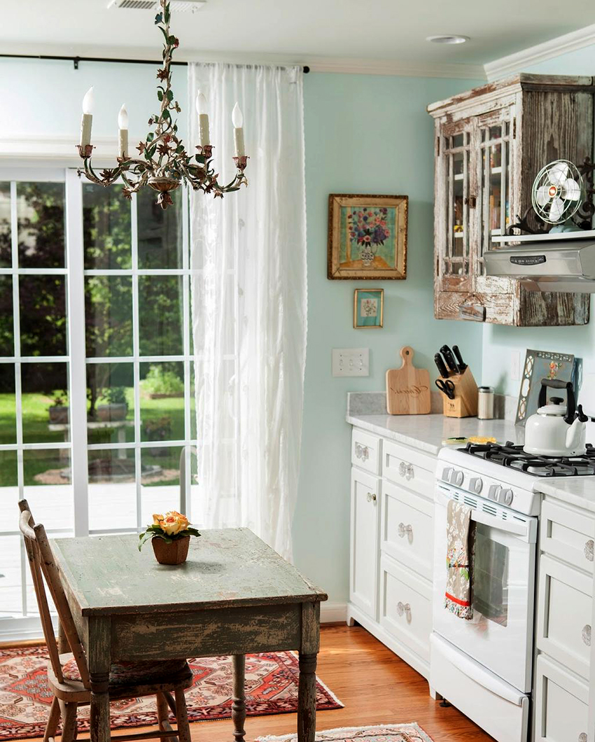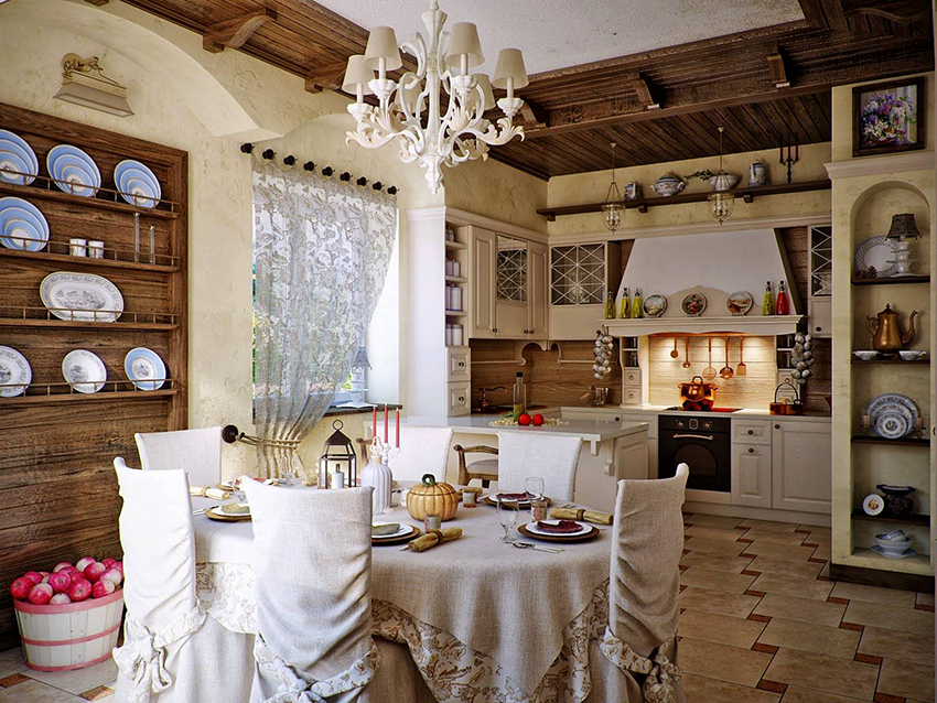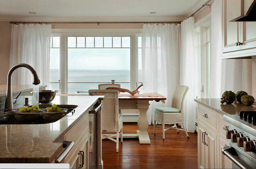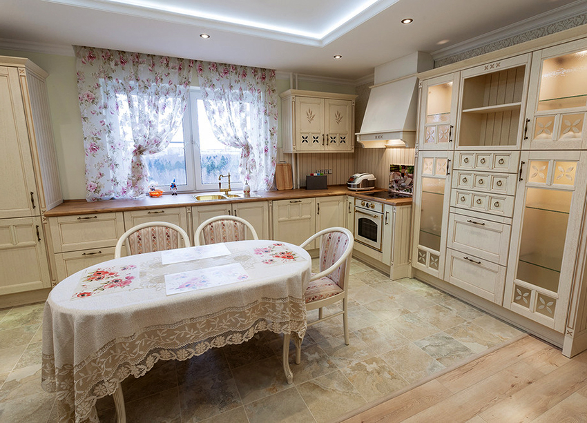 Very often, mesh tulle in the kitchen is sewn with their own hands using the technique of combining fabrics, using linen and polyester-based materials. Mesh tulle is appropriate for creating interiors in the Provence style or for organizing designs in a nautical theme. For this purpose, it is recommended to decorate products with the help of small ropes, elements in the form of shells, starfish and other marine life.
