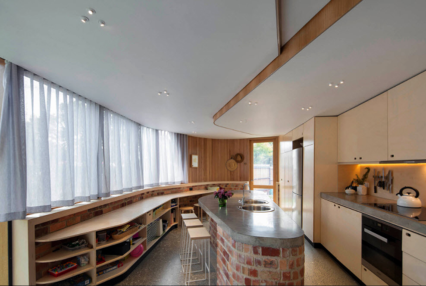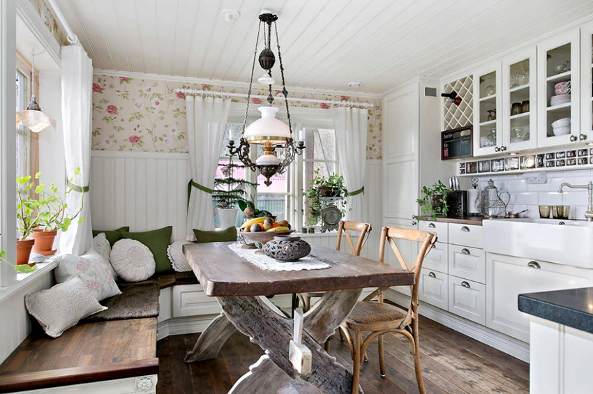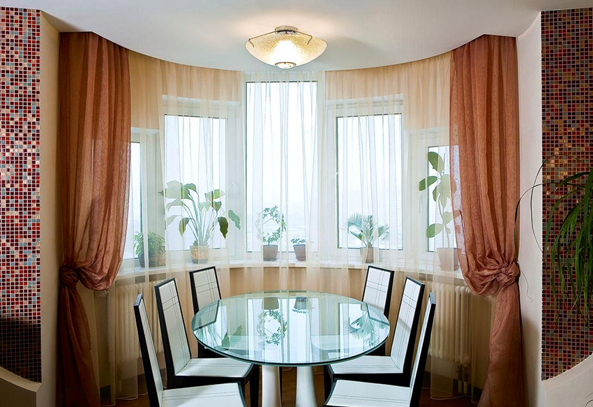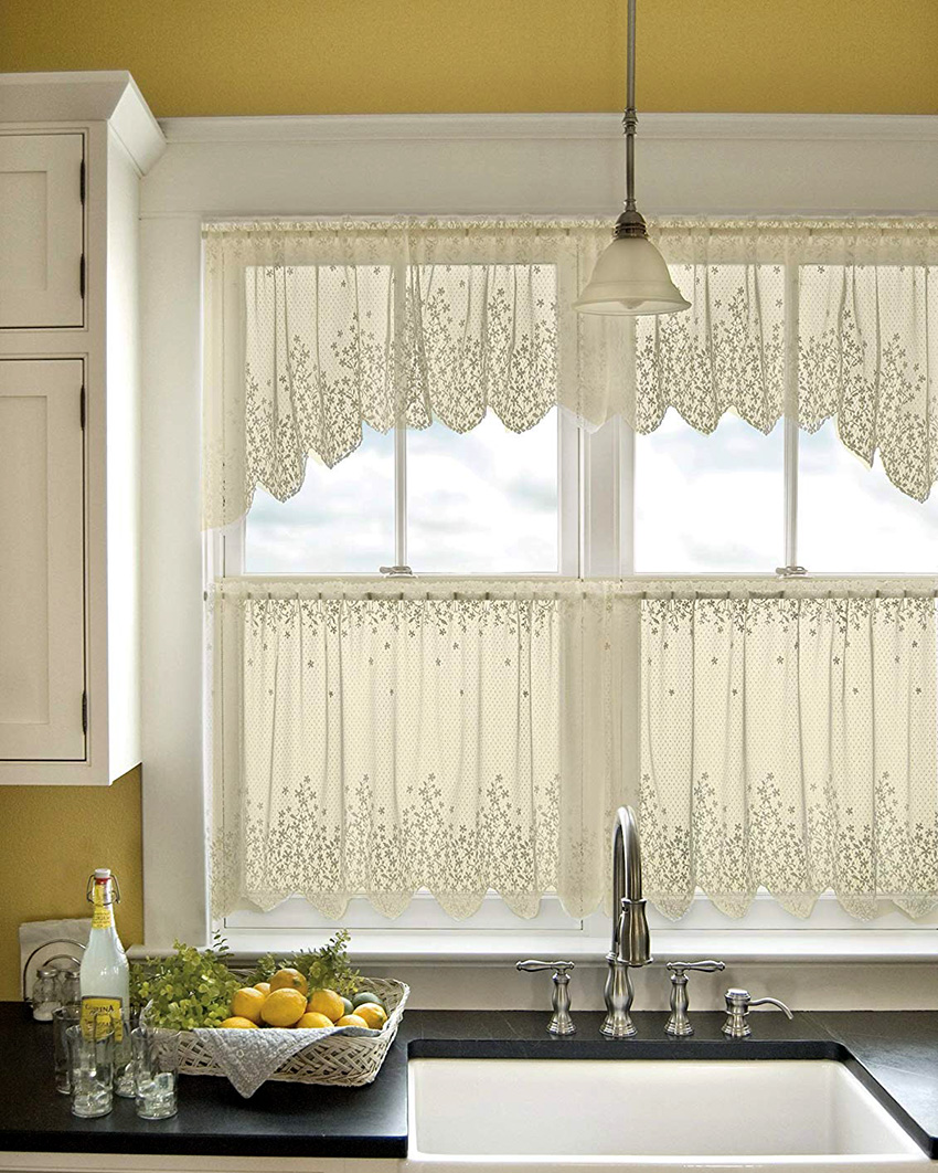 In a country or rustic style in the interior, you can often find an arch tulle in the kitchen, when using which the window sill area remains open. This option is especially relevant when a work surface is organized under the window and an additional tabletop section is installed. Organza or veil arches are made either with a decorative fold, or by interweaving two triangular-shaped canvases. To create an individual design, it is recommended to use different types of fabrics that are similar in color, texture and texture.