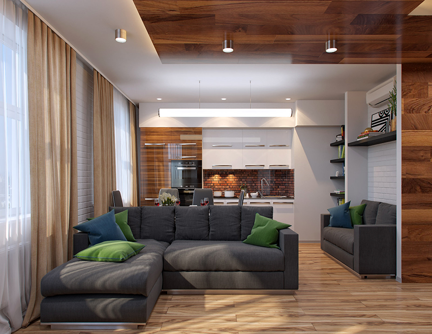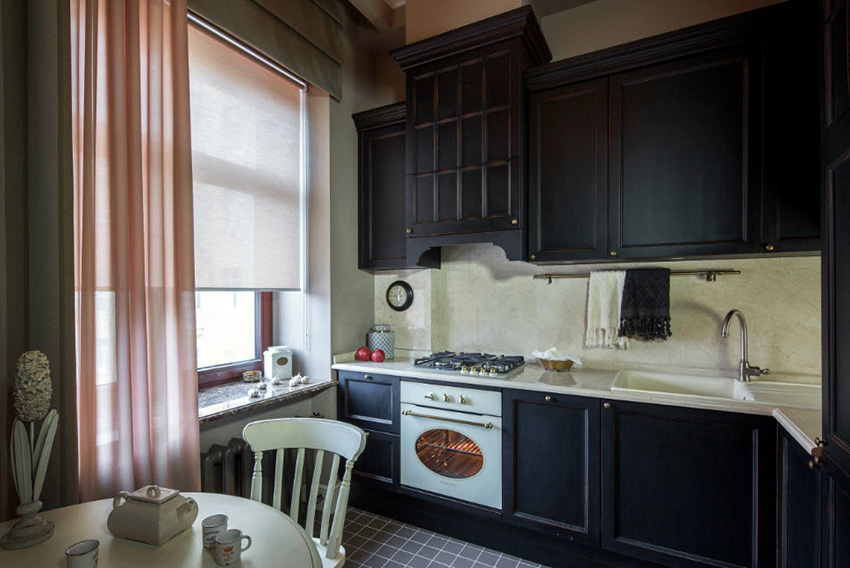In a small room, using a dark tulle color will not be appropriate. Color options such as gray, dark blue or brown are best left to create the interior of a spacious room that has sufficient illumination, the windows of which face the sunny side. It is also important that there is another piece of furniture in the kitchen to match the curtains.
