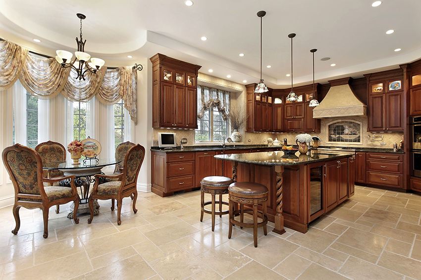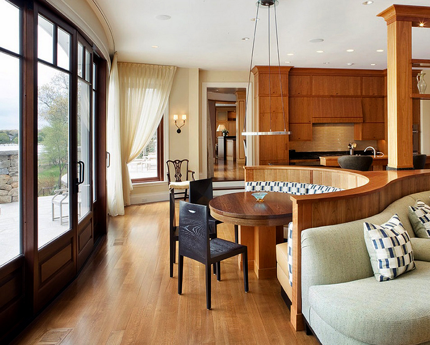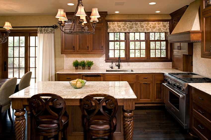 Kitchen tulle on eyelets is considered the most convenient and common mounting option, which is suitable for any kitchen interior. In this case, in the manufacture of tulle, a translucent fabric is used, which is distinguished by its density, because metal rings will need to be imprinted into the edges. The mesh curtain on the eyelets, which is located on the wooden cornice, will be an excellent addition to the classic interior, made with wood elements.