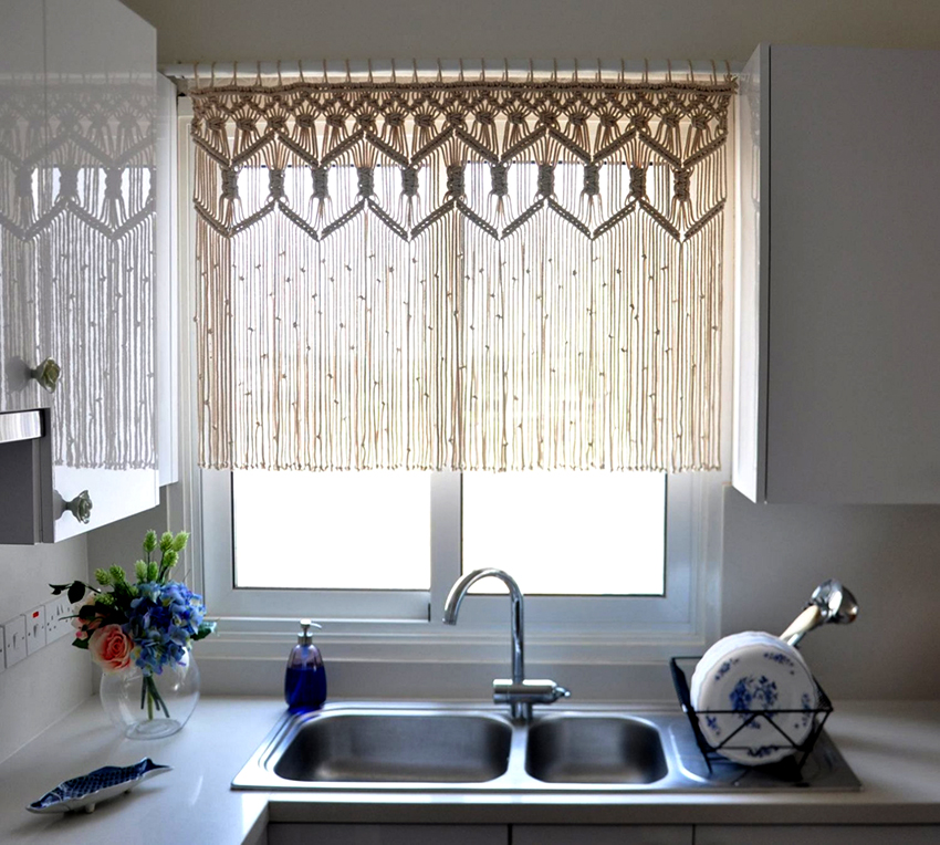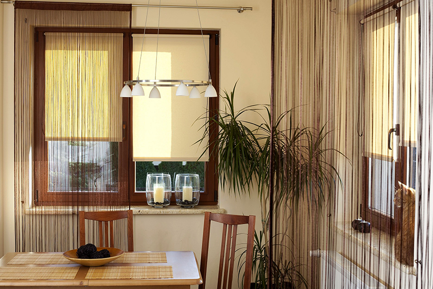 Thread tulle (called muslin) is considered the least common way to decorate kitchen windows. This option is a curtain consisting of a large number of shiny and thin threads that can be decorated with a variety of decorative elements. Synthetic variants and natural fabrics such as linen, cotton and silk are used as materials used for the production of muslin.