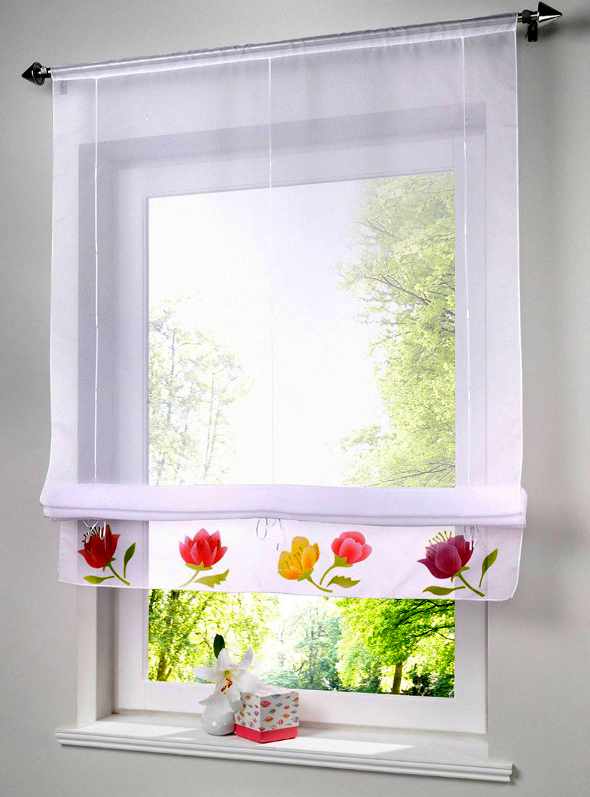 The tulle itself is made from various materials, but the most popular are polyester, silk and cotton, and the finished tulle for the kitchen looks like a light transparent curtain covering the window.