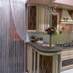 The main advantages of using curtains-threads include their lightness, the ability not to clutter up the interior and transmit both light and air well. Due to their transparency, such products are suitable for creating an interior not only for a small, but also for a large kitchen. In the photo of tulle and curtains, you can see that the threads are most often combined with organza products or supplemented with a soft or hard lambrequin, for the decoration of which fluffy folds are used, lowered on the sides of the window opening.