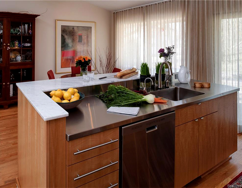 The disadvantages of using organza include the fact that the fabric does not "breathe" well and delays the passage of fresh air. If you use organza curtains, you need to ensure that the curtains can be easily pulled apart to ventilate the kitchen. The main advantage is considered to be the high wear resistance of the fabric, which does not wrinkle, is easy to clean and is resistant to the accumulation of dust particles. If the tulle will be near the gas stove, then you should choose non-combustible fabrics that are conducive to a fire-fighting environment in the room.