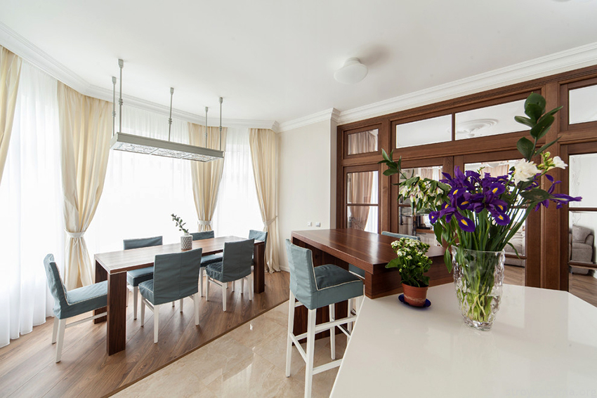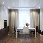 Ceiling cornices it is especially important to use it to visually raise the height of ceilings. Long floor-length curtains are perfect for this. In this case, the tulle is attached with hooks. Elongated tulle, the edges of which lie on the floor, will help to make the room soft and cozy, but it must be borne in mind that such curtains will get very dirty. If the option of a stringed metal cornice was chosen, then it is used in order to install a light tulle made of voile or organza, made in one layer. Baguette or tubular cornice is mostly used as an element of kitchen decor.
