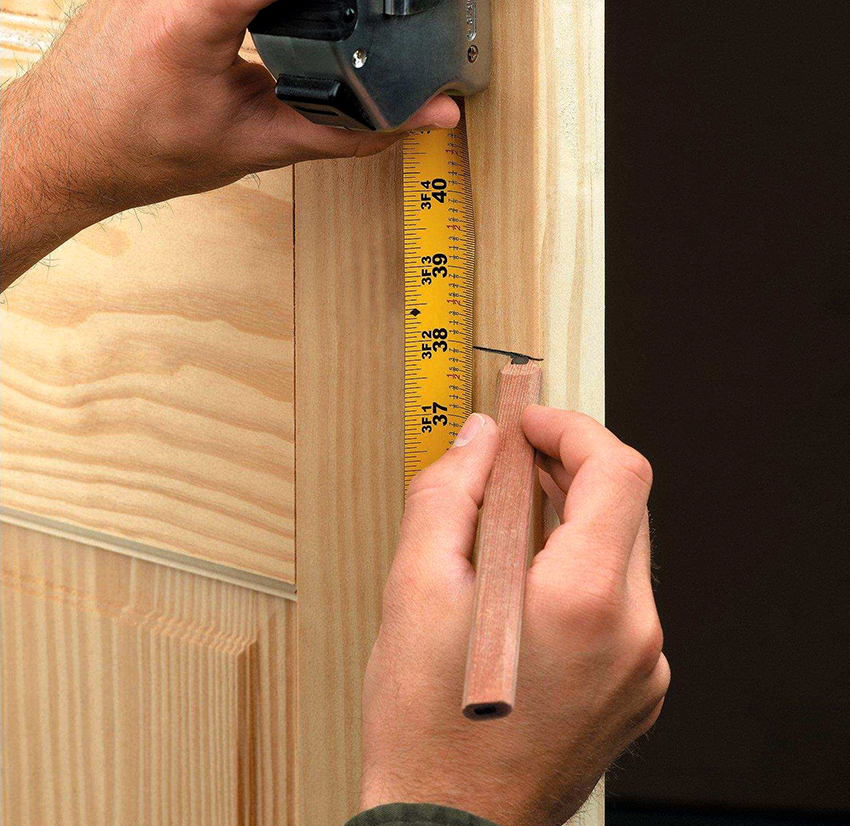 Next, you need to mark the positions in which the latch and handle will be located. After that, the marking of the mating hole located on the door frame is made.