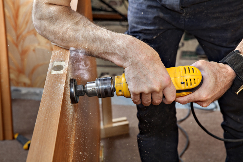 The next stage, which follows the marking of the door leaf, involves making holes for the handle and the locking mechanism. This process is also subdivided into several stages.