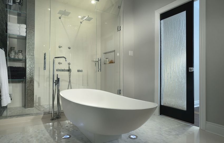 Bathroom door made of embossed frosted glass