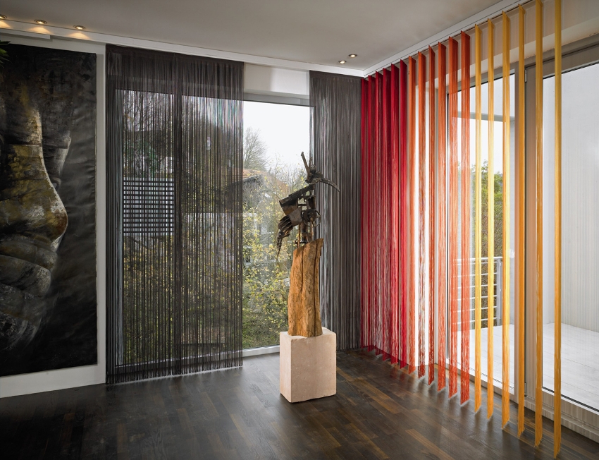 Another interesting type of vertical fabric curtains is the String window cloth, where the lamellas are presented in the form of rope elements. The product is not only the embodiment of decor, but also serves as a full-fledged curtain. Fabric blinds have a rather dense structure, however, unlike dense curtains, there are no weighting agents in their lower part, which allows the rope brush to fall freely to the floor, filling the room with lightness and airiness.