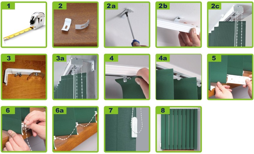 Installation of vertical blinds: 1 - markings, 2 - fastening to the ceiling or window opening using latches, 3 - fastening to the wall using brackets, 4 - installing lamella holders in runner clips, 5 - installing lamella weights, 6 - mounting a chain, 7 - installation of a plumb line, 8 - checking the structure for operability