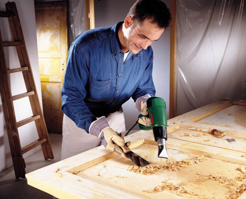 The door must be removed from its hinges, laid horizontally, having previously unscrewed the fittings, and with the help of a hair dryer (if the layer is thick) or sanding, remove the old coating. It is necessary to carefully examine the canvas so that there are no traces of old varnish, paint or unpolished places.