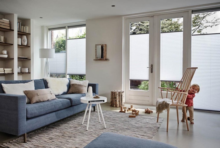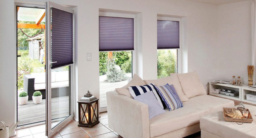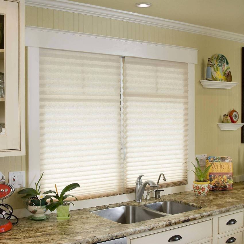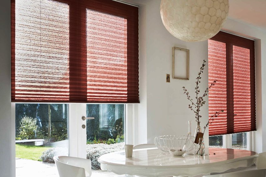 - Blinds-pleated - the material of the curtain is folded in the form of an accordion. The adjustment is carried out with special cords and tapes, at the ends of which there are special clips.