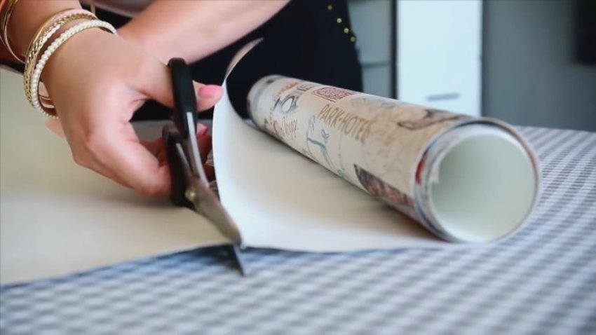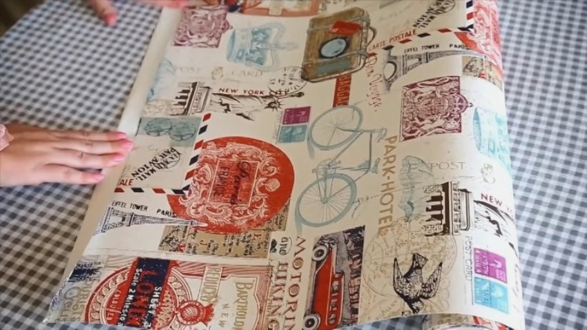 - then the wallpaper is spread and the required rectangle is cut out of the material. It is important to ensure that the drawing on the canvas is not distorted or cut off. To prevent the roll from curling up on the table, its edges can be pressed with a small weight. If the window is wider in width than the width of the wallpaper, then you can connect the two canvases with glue or tape;