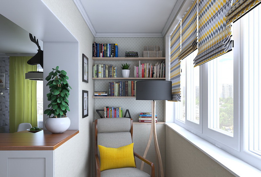 Blinds can be installed in a balcony doorway only if the balcony or loggia has high-quality insulation and glazing. Raising or closing such a partition will increase the overall space of the living space. Most often, the balcony is combined with a kitchen, living room or bedroom. In this zone, you can equip a rest corner, a compact dining room, a workplace.
