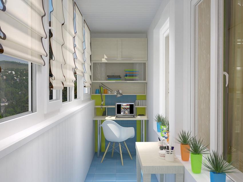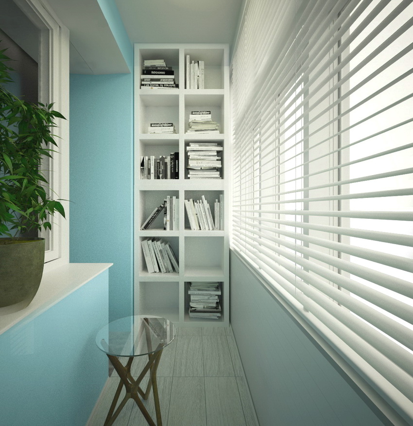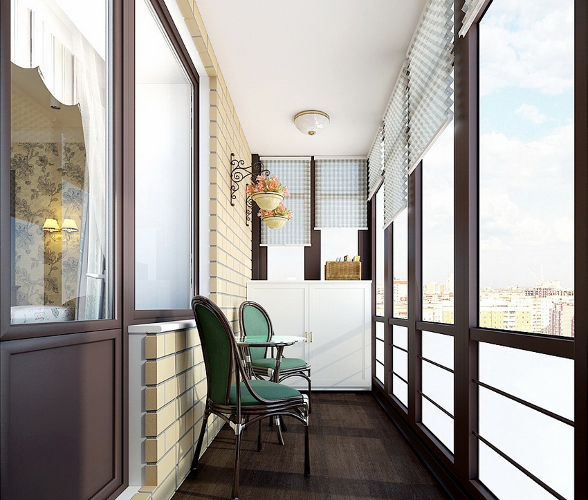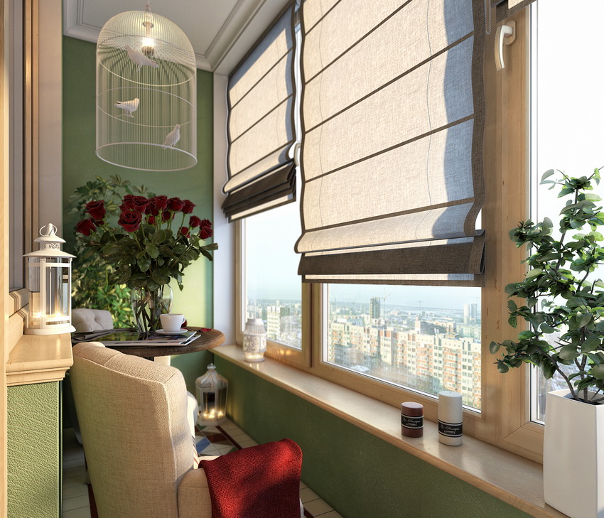 If the balcony has blind ends, then different modifications can be used to decorate the windows. It is not recommended to select vertical blinds for small open areas, since their installation will require a curved cornice, which has a high price. The optimal model is selected taking into account the location of the building. On the south side, it is advisable to fix light-colored fabric canvases, which will protect the room from the scorching sun.