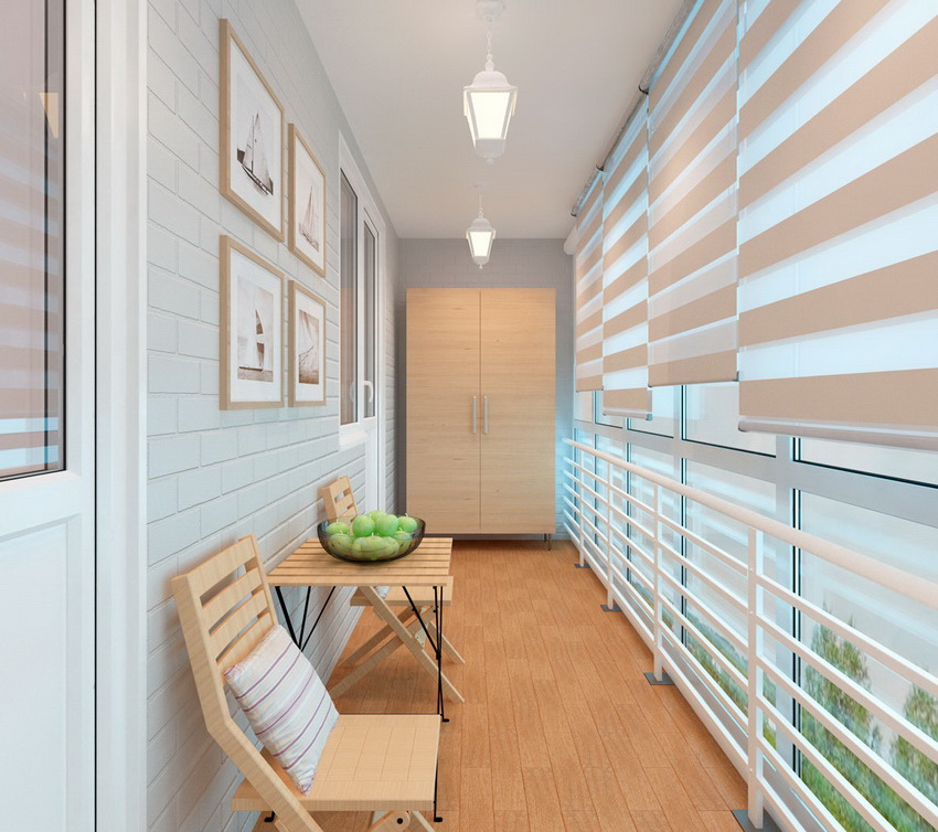 Horizontal blinds, although they look neat, are not able to create a cozy atmosphere on the balcony. They are exclusively suitable for minimalist spaces.