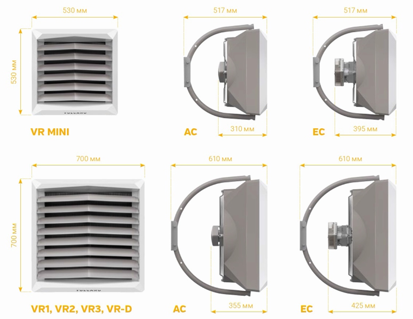 Fan heaters are available in six standard sizes. These are very popular heating products, therefore they have a wide range of models from many manufacturers. There are two-row and three-row models. Heater power from 10 to 60 kW allows you to select equipment for rooms with different areas.