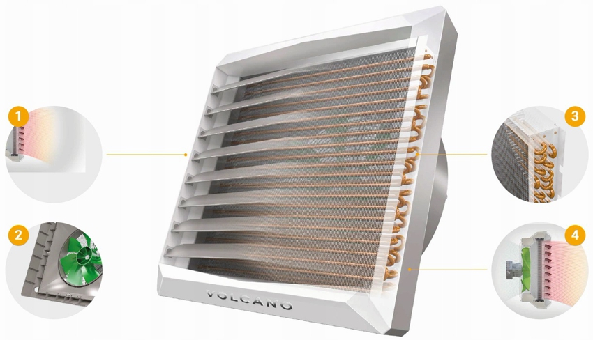 The device is equipped with a silent axial fan with blades made of special profiles and bearings of the highest class, which do not require lubrication. Such a device provides high performance with low power consumption. In addition, the air flow is adjustable within the operating range. The heating medium is water from the centralized heating system.