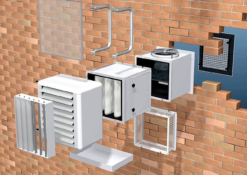 The units are installed in the middle of the ventilation duct, which has a circular or rectangular cross-section. The air coming from the street is passed through the filtration system and enters the air heater for supply ventilation, where it is heated by heat, which is given off by the water heating system, which flows to the heat exchanger through the air heater duct.