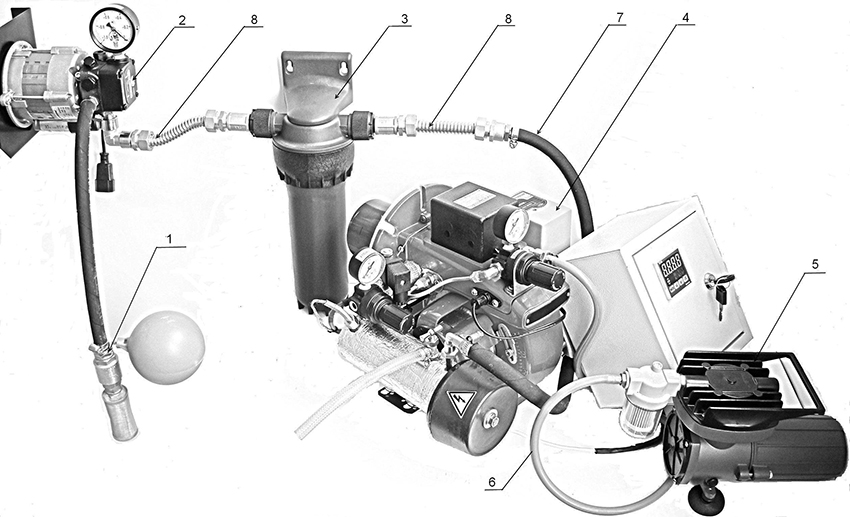 Burner assembly diagram, where 1 - fuel intake; 2 - fuel pump; 3 - fuel filter; 4 - burner; 5 - compressor; 6 - air compressor hose; 7 - fuel hose; 8 - fuel line