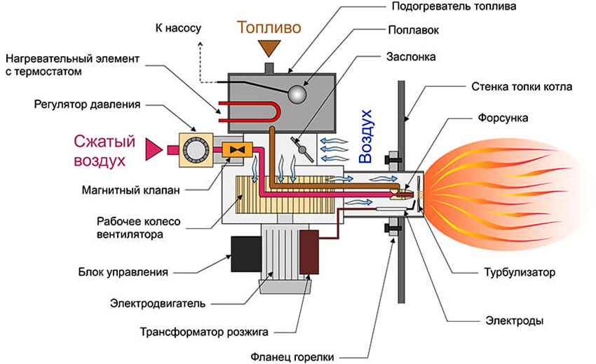 Successful air delivery requires a mini-compressor built into ready-made liquid fuel fixtures. It can be transported in other ways, for example, by the pneumatic principle. In the absence of compressed air, the nozzle may not work correctly.