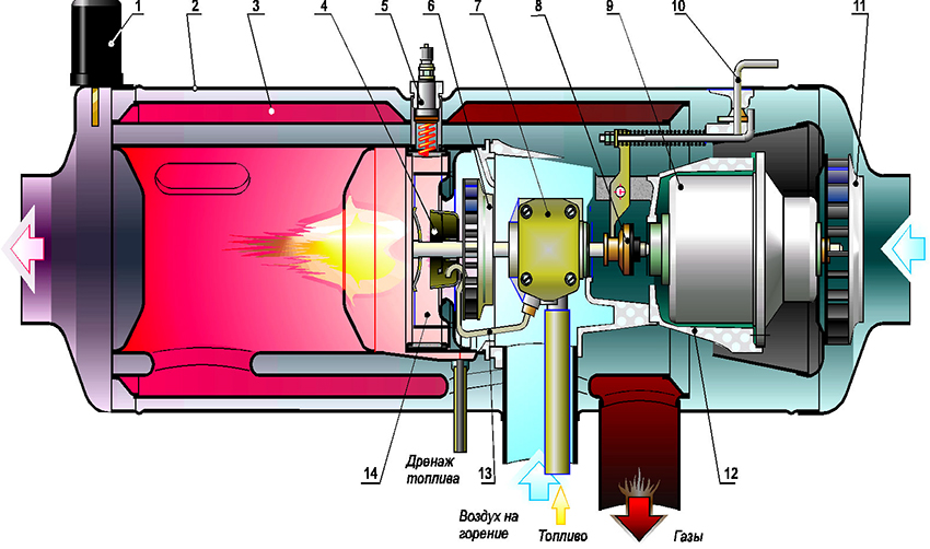 Burner diagram according to the Babington principle, where 1 - heating sensor; 2 - casing; 3 - heat exchanger; 4 - fuel atomizer; 5 - glow plug; 6 - supercharger; 7 - fuel pump; 8 - friction clutch; 9 - electric motor; 10 - lever for switching operating modes; 11 - fan; 12 - skeleton; 13 - fuel pipe; 14 - combustion chamber
