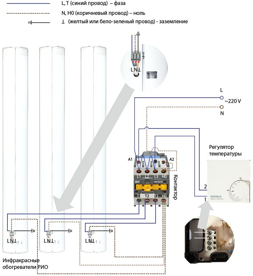 - Make electrical wiring. The wires from the device must pass to the thermostat, they are connected according to the diagram attached to the device. Usually, three heaters are connected to one regulator, but there are models with five connectors.