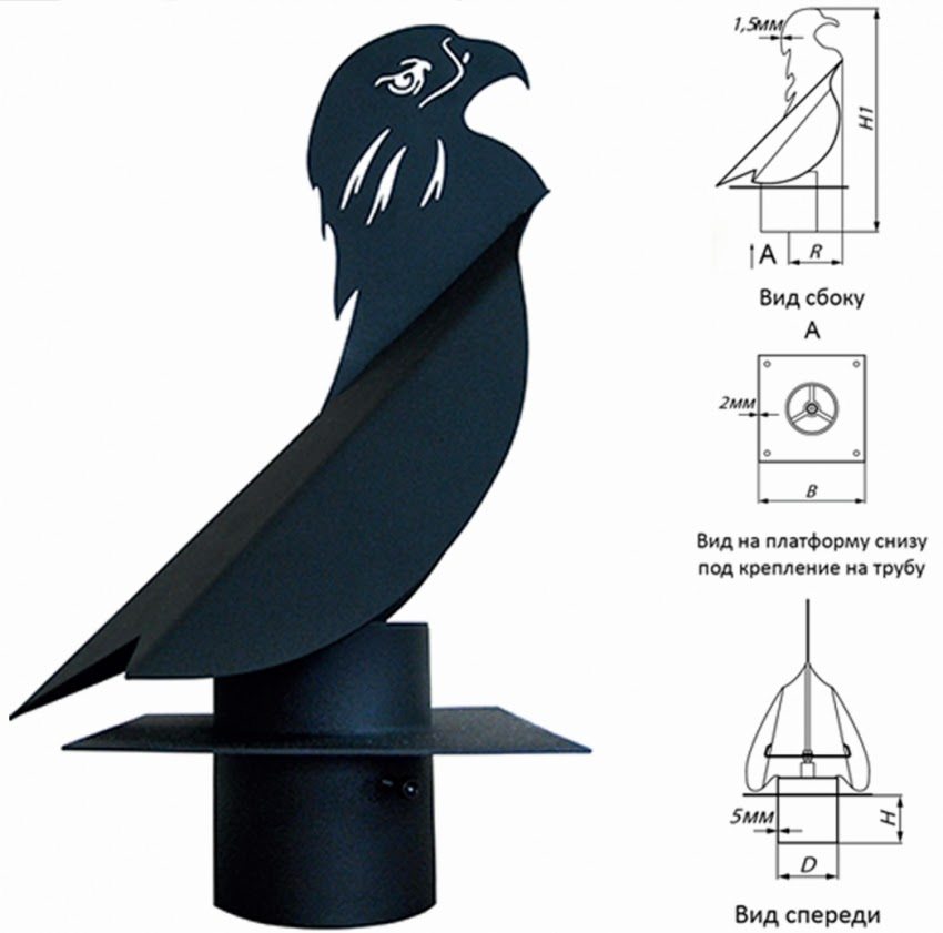 Weathervane with a weather vane differs in that a special damper is located inside the structure, which allows combustion products to calmly exit the chimney even in the most windy weather. And an additional opening cover provides easy access to the flue ducts for cleaning.