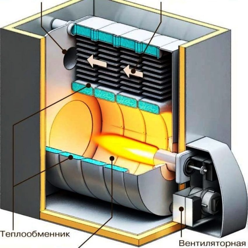 The heat exchanger distributes the heat received. The generated combustion products are fed to the chimney. A mandatory process is the preheating of the mining. Oil contains many impurities, under the influence of a certain temperature, the process of decomposition of the substance into simple carbons takes place, which are subsequently burned. As a result, water vapor, nitrogen and gas are formed, which are harmless to the body.
