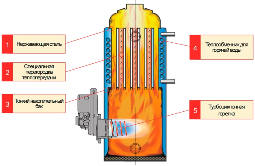 For hot water boilers using waste oil, a water tank with a volume of not more than 140 liters is used. It heats up for 2 hours, which is several times faster than the speed of a modern electric boiler. The oil water heater can operate in two modes: fast and wick. The first option is used to heat completely cold water. The wick mode allows the water in the container to be warmed up. However, this will require a large amount of fuel resources.