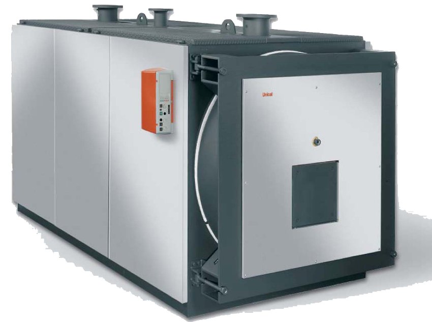 The Italian manufacturer Unical produces boilers with a capacity of 35-1100 kW. A cylindrical firebox with a blank bottom has an inversion memory. The device has three boiler block gas ducts. Thanks to the short torch, a high quality of heat exchange is ensured and the level of convection is increased.