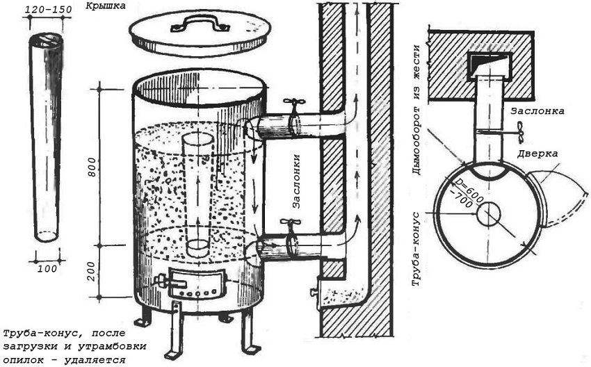 The data obtained are reflected on a scale drawing of a long-burning boiler with their own hands, according to which the volume and approximate amount for the purchase of consumables are determined.