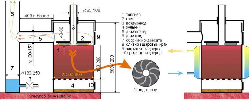 The floor is covered with asbestos or basalt cardboard (thickness 4 ÷ 6 mm). A sheet of galvanized roofing iron (2 mm thick) is placed on top. Direct contact of the floor with the body excludes supporting structures - boiler legs.