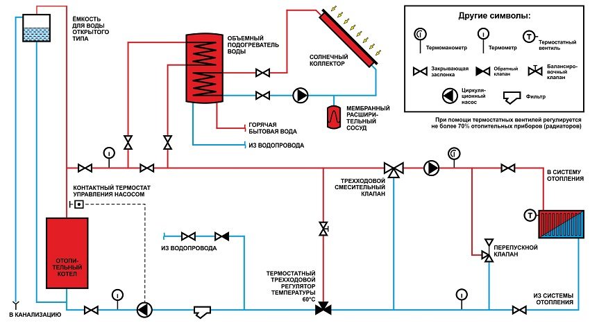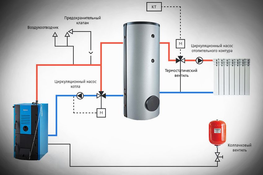 The coolant supply pipe to the consumer system is located at the top. Return pipe connection - bottom. Cooling of the return heat carrier below 65 ° C is dangerous for acid condensate falling out on the walls of the heat exchanger, which destroys steel. With a low boiler output, the temperature between the flow and return lines is equalized by installing a bypass valve. The boiler circuit of a large house is supplemented with an elevator unit and a circulation pump.