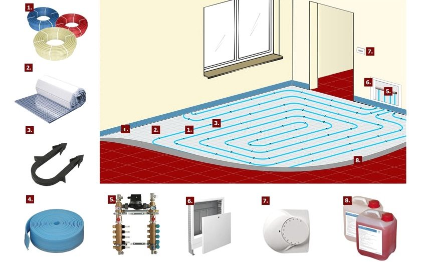 Components for the installation of a heating system "warm floor": 1 - cross-linked polyethylene pipe, 2 - heat-insulating mats, 3 - pipe fastening brackets, 4 - damper tape, 5 - collector, 6 - collector cabinet, 7 - wall thermostat, 8 - plasticizer