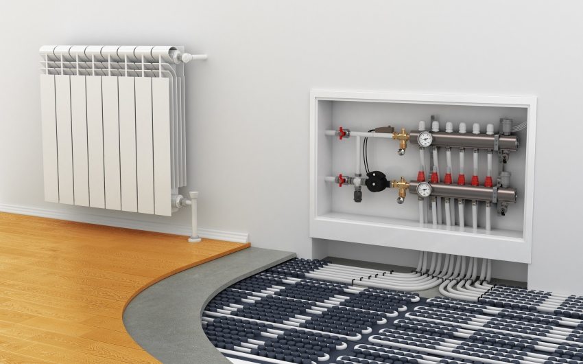 Specialized organizations install underfloor heating from central heating in apartments during the construction of a building. The principle of underfloor heating device differs from central heating in an apartment by the way of connecting low-temperature circuits. The coolant enters the pipes of the water-heated floors in a separate riser from the radiator heating. Hot water for underfloor heating is prepared by a heat exchanger, which is installed in a central heating point, a heating unit of an apartment building or directly in a consumer's apartment.