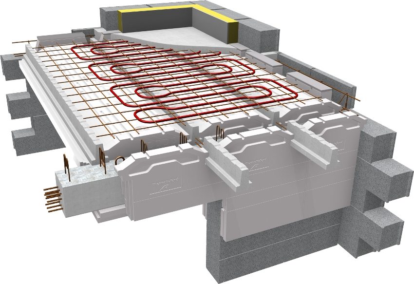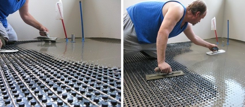 On concrete slabs, warm water floors are arranged in a bulk cement screed. The concrete base is lined with waterproofing, a layer of insulation and reinforcing mesh are laid. Pipes are attached to the cells of the frame using clamps, special clamps or steel wire. On top of the pipe loop, to evenly distribute the operating load of the floor covering, if necessary, a reinforced screed is also arranged.