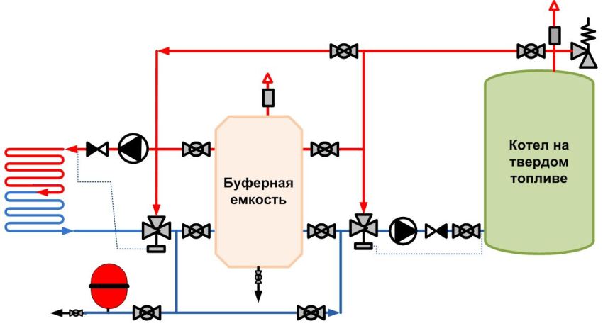 Solid fuel boilers for long burning on wood are distinguished by a complex adjustment of the combustion mode. The installation of underfloor heating in heating systems with a solid fuel heat generator, in addition to a circulation pump, requires the installation of a buffer tank. The heating medium is taken directly from the hydraulic accumulator to the underfloor heating system.