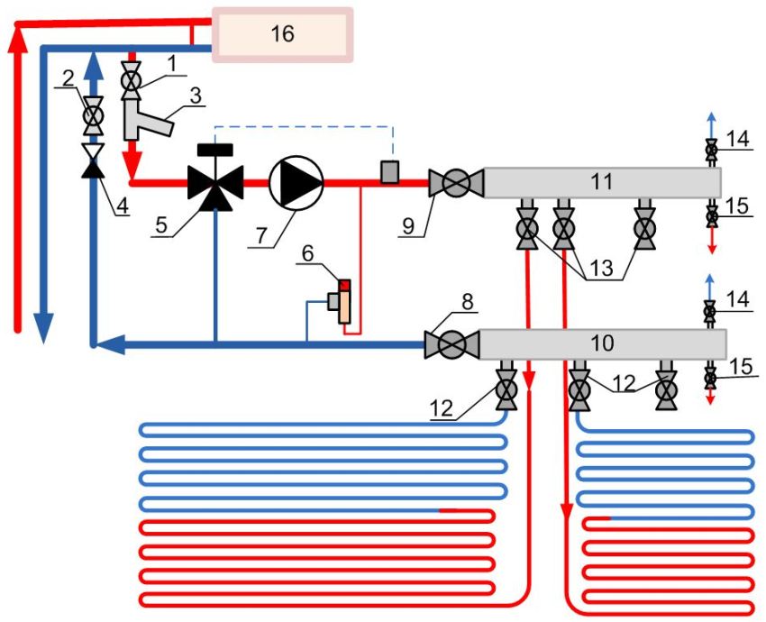 Diagram of inserting warm water floors into the radiator circuit of central heating: 1 - ball valve on the inset of the supply line; 2 - ball valve on the return line tie-in; 3 - mesh filter; 4 - check valve; 5 - three-way mixing valve; 6 - bypass valve; 7 - circulation pump; 8 - valve at the outlet of the return manifold; 9 - shut-off valve at the inlet of the supply manifold; 10 - return manifold; 11 - supply manifold housing; 12 - ball valves on the return line of the circuit; 13 - ball valves on the supply of the circuit; 14 - air vent valve; 15 - drain valve; 16 - radiator