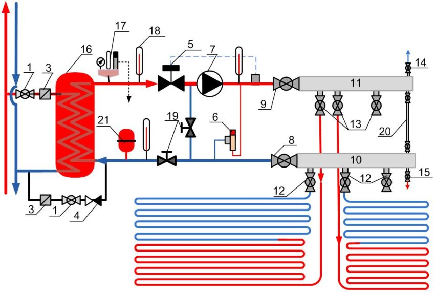 Semi-autonomous scheme for connecting warm water floors in an apartment: 1 - ball valve in the tie-in into the supply riser; 2 - ball valve on the bypass to the return riser; 3 - mesh filter; 4 - check valve; 5 - two-way valve (temperature sensor with a servo drive); 6 - bypass valve; 7 - circulation pump; 8 - valve at the outlet of the return manifold; 9 - shut-off valve at the inlet of the supply manifold; 10 - return manifold; 11 - supply manifold housing; 12 - ball valves on the return line of the circuit; 13 - ball valves on the supply of the circuit; 14 - air vent valve; 15 - drain valve; 16 - heat exchanger; 17 - security group; 18 - thermometer; 19 - control valves; 20 - bypass between the supply and return collectors; 21 - expansion tank of membrane type