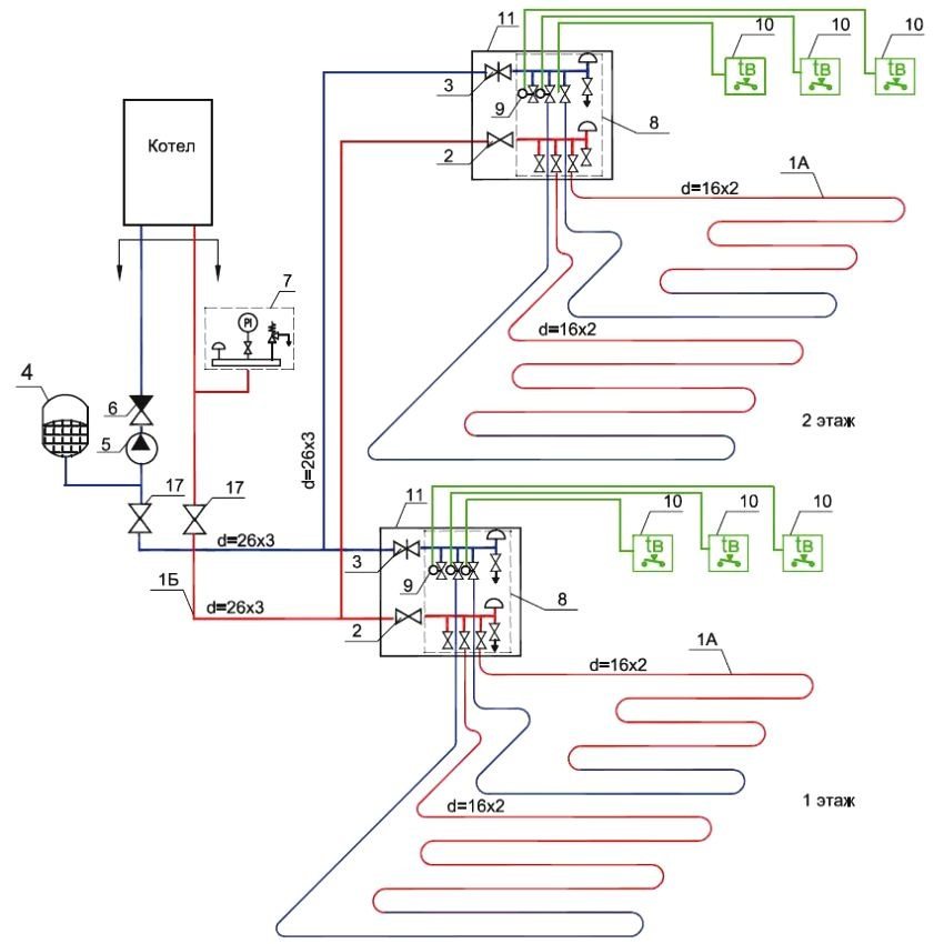 Heating scheme for a two-story house with automatic temperature control in the premises: 1A - pipe 16 mm; 1B - pipe 26 mm; 2 - ball valve; 3 - direct-flow valve; 4 - membrane tank 24 l; 5 - circulation pump; 6 - check valve; 7 - security group; 8 - collector block; 9 - electrothermal servo drive; 10 - electronic thermostat; 11 - distribution cabinet; 12 - connector; 13 - self-sealing plug; 14 - nipple; 15 - crimp connector; 16 - corrugated casing; 17 - ball valve