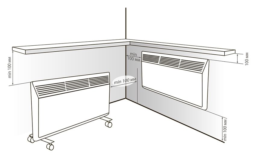Please note that the lower edge of the convector body must not be lower than 15 cm. Do not bring the device closer to the wall or any objects by more than 25 cm. The distance between the upper edge of the convector and any objects should not exceed 45 cm. fire safety system, and if the upper slot is accidentally closed by something, the automation will work and the device will simply turn off. Therefore, you cannot dry things on heaters, cover it with something or put a high convector under the window.