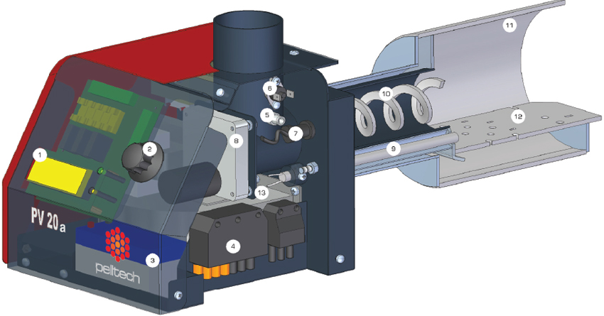 Pellet burner device, where 1 - LCD display, 2 - control knob, 3 - backup battery, 4 - connecting socket, 5 - fuel level sensor, 6 - safety thermostat, 7 - photo sensor, 8 - internal auger motor, 9 - igniter , 10 - internal auger, firebox, 11 - combustion grate, 13 - fan