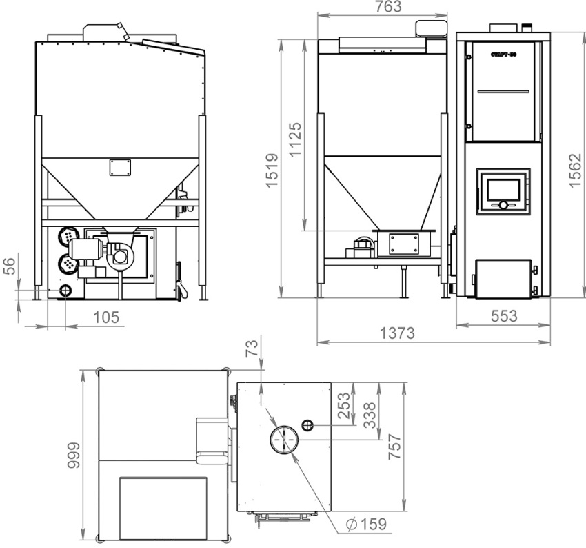 The body of the device is made of durable, heat-resistant steel. The furnace of such a unit has a sluice valve, the function of which is to protect the hopper from the ingress of flame. The hopper itself can be mounted on either one or the other side of the boiler body.