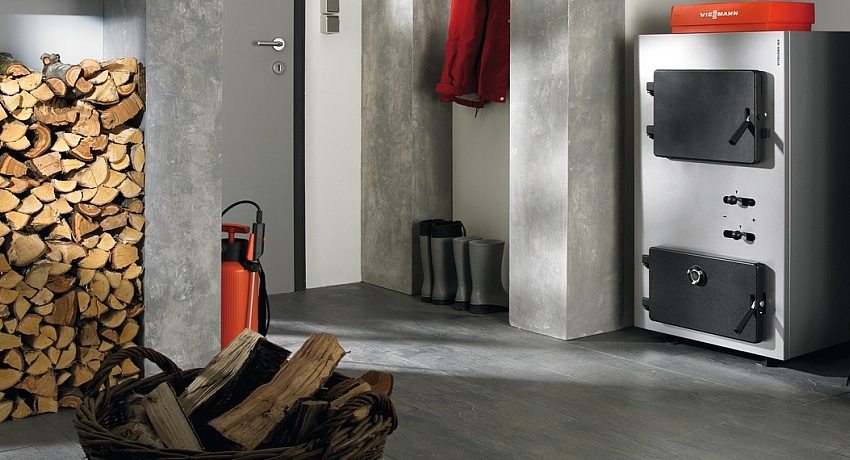 Placement example solid fuel boiler with automatic feeding of pellets from a storage bin in the basement of a private house