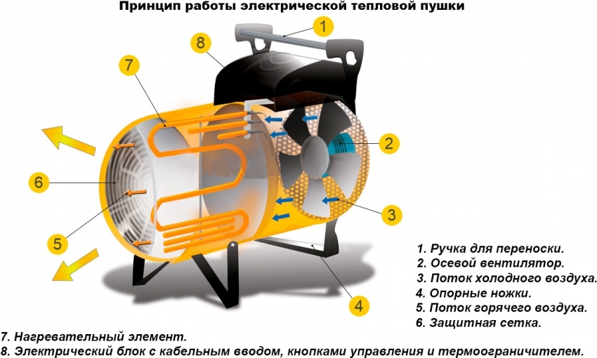 Note! Electrical appliances are environmentally friendly and safe. Their operation is not accompanied by the release of exhaust gases and toxins. Therefore, it is allowed to use an electric gun to heat residential premises without a threat to human health.