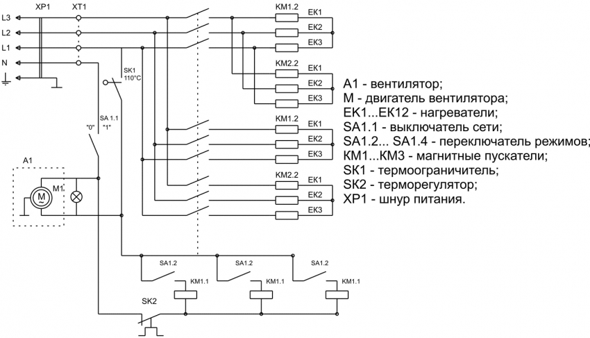 The ventilation device generates air flows that pass through the heating element, and the thermostat regulates the room temperature. This component protects the structure from overheating. When the air temperature reaches the required value, the thermostat automatically cuts off the power supply.